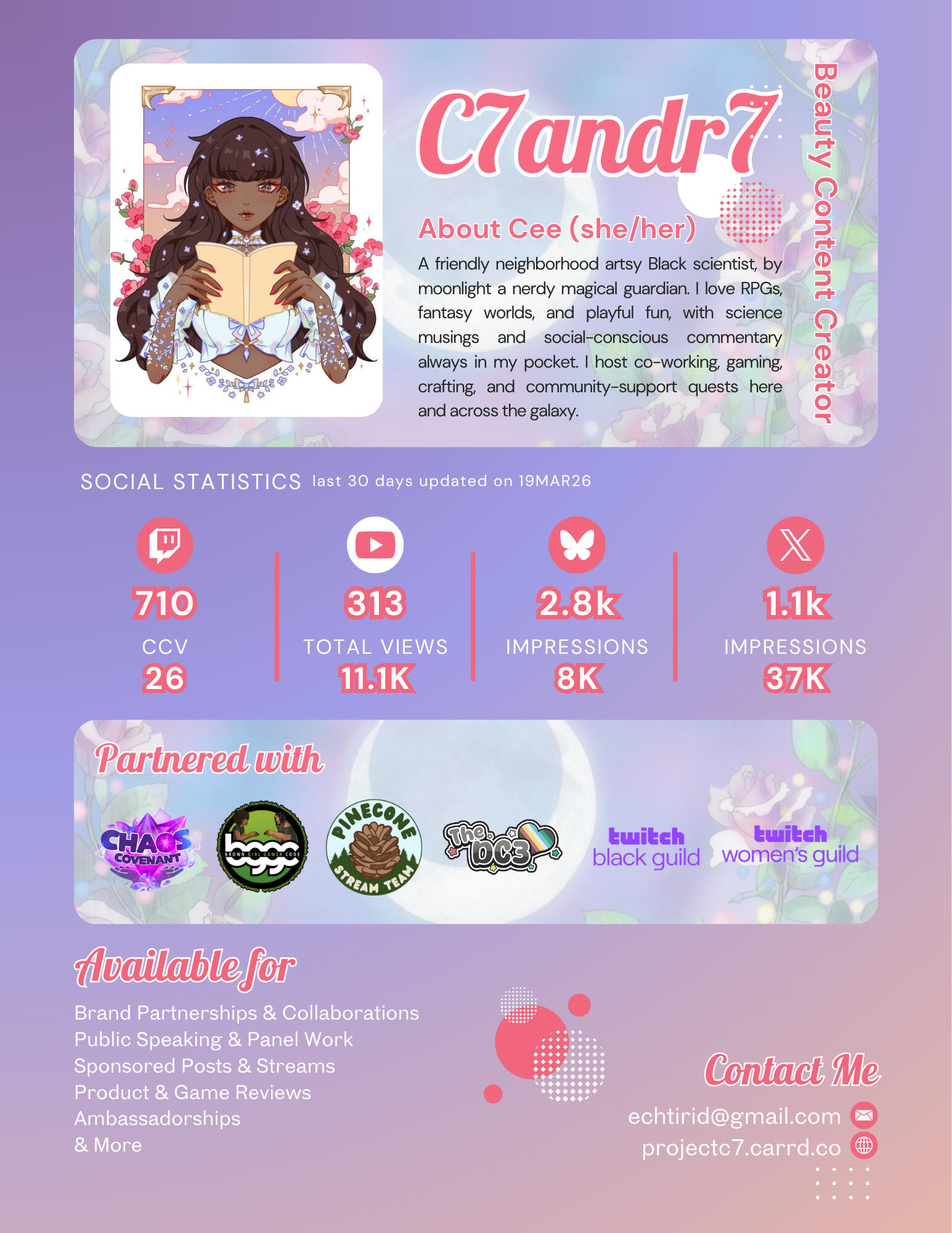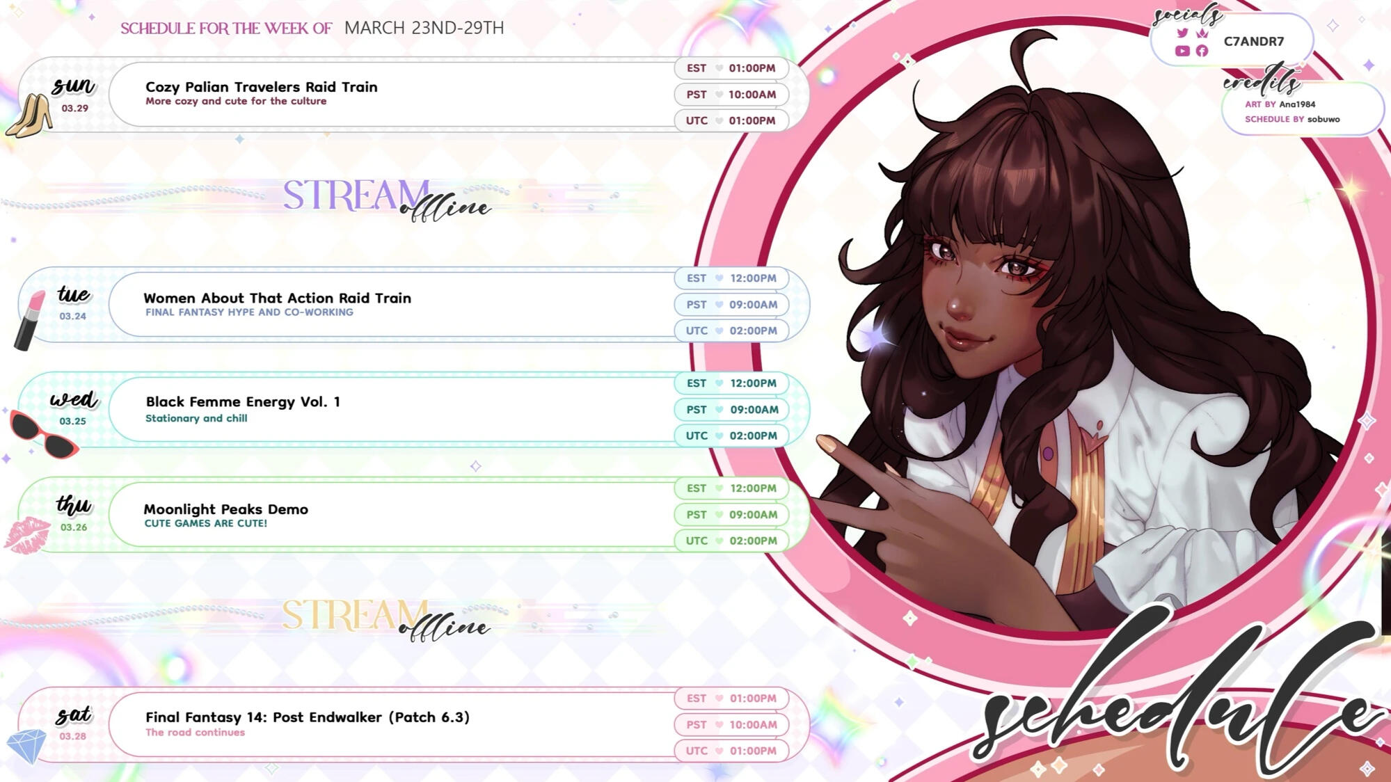 Welcome to my page! Call me Cee (or C7), I use she/her pronouns and I'm a Black Artsy Doctoral student who streams on YouTube and Twitch.I mainly RPGs, Action/Adventure and story-driven character games with atmosphere, music and compelling art. Some of my favorites are FFXIV, Monster Hunter Wilds, Neva, South of Midnight, and No Straight Roads. I'm a huge fan of the Monster Hunter/Final Fantasy Series.If I'm not gaming, I do co-working streams and craft streams - anything from stationary, stickers and washi tape for Hobonichi Techo to lace making on stream (Lace Bobbin with a special love for Torchon Lace). Streaming is for fun and hobby (as science and art are the true loves of my life). I mainly stream Thursdays, Fridays, Saturdays, and Mondays in the afternoons/early evenings.On Sundays, for my DnD Shenangians (Mystical Squadron Valorangers), I play as Nambra Kaylnn/Valor Pink. This campaign is on Sundays at 7pm EST over on TokuTableTop.All of my fun can be found mainly on YouTube with VODs if you ever miss a stream!Please check out the other campaigns and other streamers who participate!